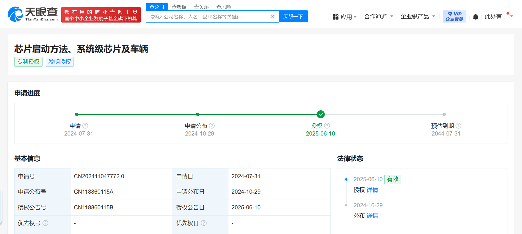 天眼查财产线索信息显示,近日,小米汽车科技有限公司申请的“芯片启动方法、系统级芯片及车辆”专利获授权。