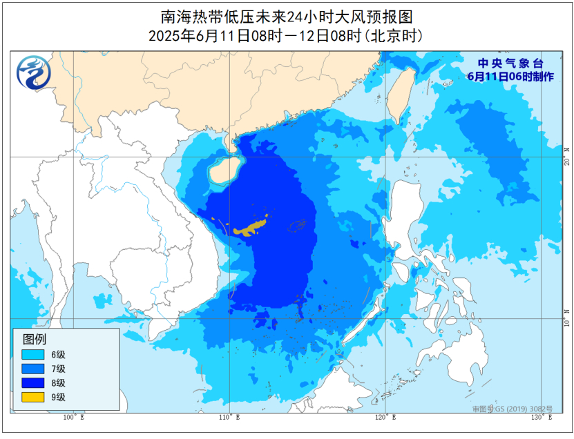 大风预报:6月11日08时至12日08时,巴士海峡、南海大部、北部湾、琼州海峡、南沙群岛、中沙群岛、广东沿海、海南岛沿海将有6-8级大风,南海中西部、西沙群岛附近海域的风力将有9级,阵风可达10-11级。