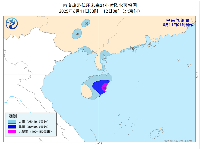 降水预报:6月11日20至6月12日08时,广东中西部沿海、广西沿海、海南岛大部、西沙群岛等地有大雨,其中,海南岛中东部的部分地区有暴雨或大暴雨(100~150毫米)。