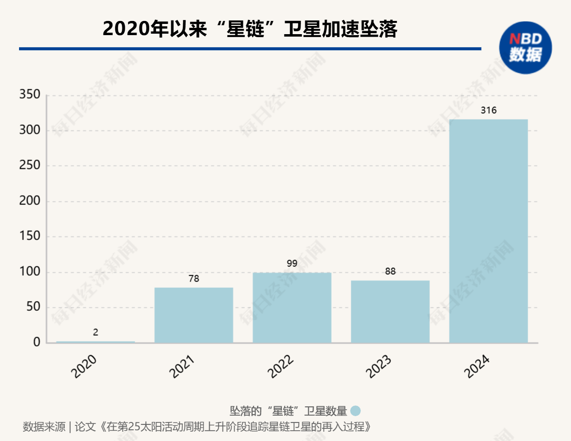 数据显示,2020年至2024年期间,共有1190颗低地球轨道卫星坠落,其中有583颗都是“星链”卫星。而在2024年,就有316颗“星链”卫星在大气层中烧毁。