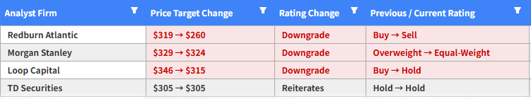 Redburn分析师将他们对麦当劳的目标价下调至华尔街最低的每股260美元——较本周一的收盘价低了近15%。在Redburn前,大摩、Loop Capital和Erste Group近期也将评级下调至“持有”。