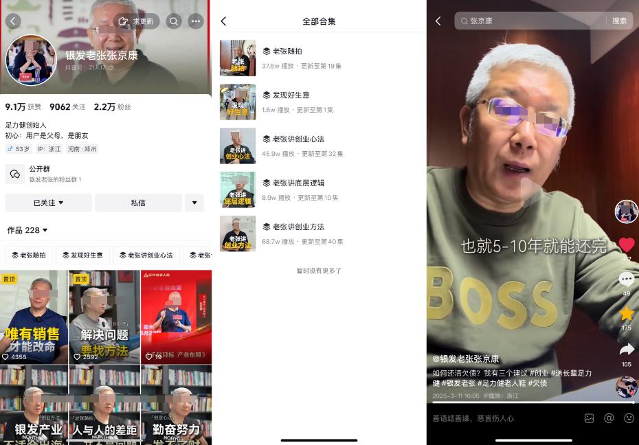 蓝鲸记者观察到,创始人张京康在多个平台上开通社交账号“银发老张张京康”,讲述创业心法、底层逻辑等。有意思的是,张京康曾不止一次在短视频中谈及“如何还债”。他表示靠直播短视频还清债务的可能性为零,真正要做的是好好复盘欠债原因、找到用户的需求痛点、提升营销能力——这样基本上5-10年就能还清10个亿。