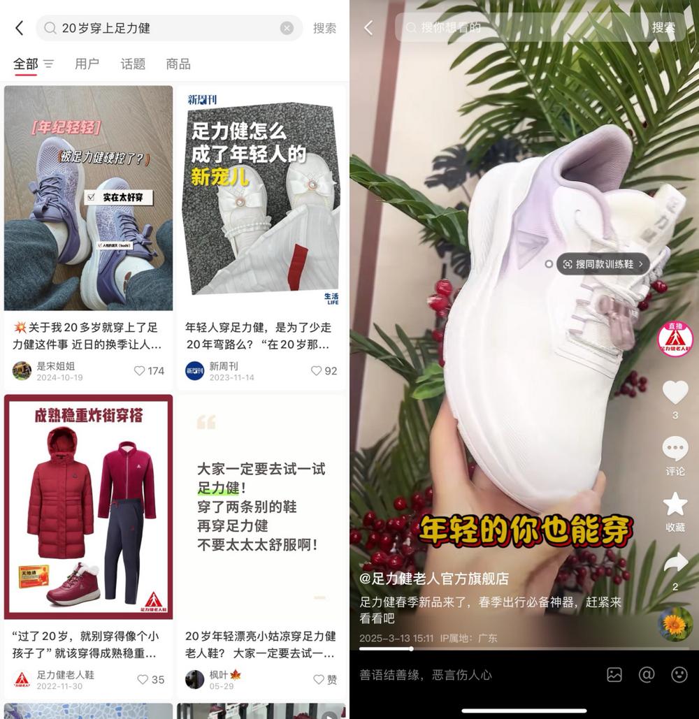 与此同时,足力健正在努力靠近年轻消费者,并强调产品的时尚美观。2024年,足力健将新代言人换成了凤凰传奇,企图借此破圈。社交网站上,“20岁穿上足力健少走30年弯路”等内容一度引发讨论。