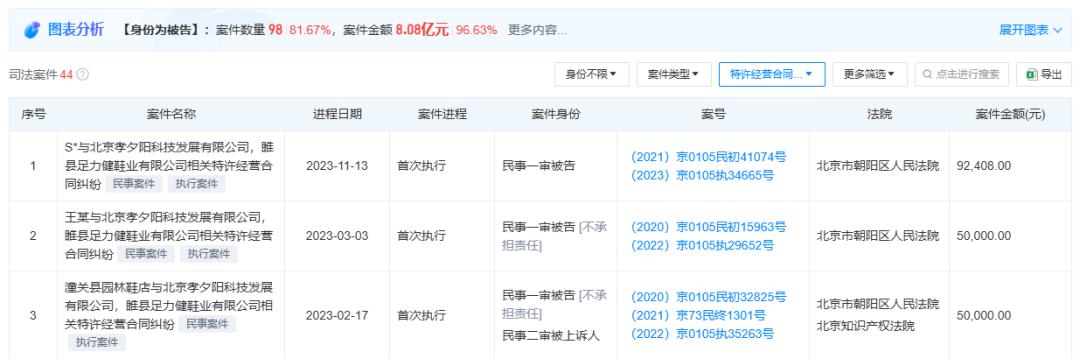 加盟模式本来就有利有弊,相关纠葛屡见不鲜。天眼信息显示,睢县足力健鞋业有限公司共涉及120条法律诉讼,其中1/3以上的案由为特许经营合同纠纷。