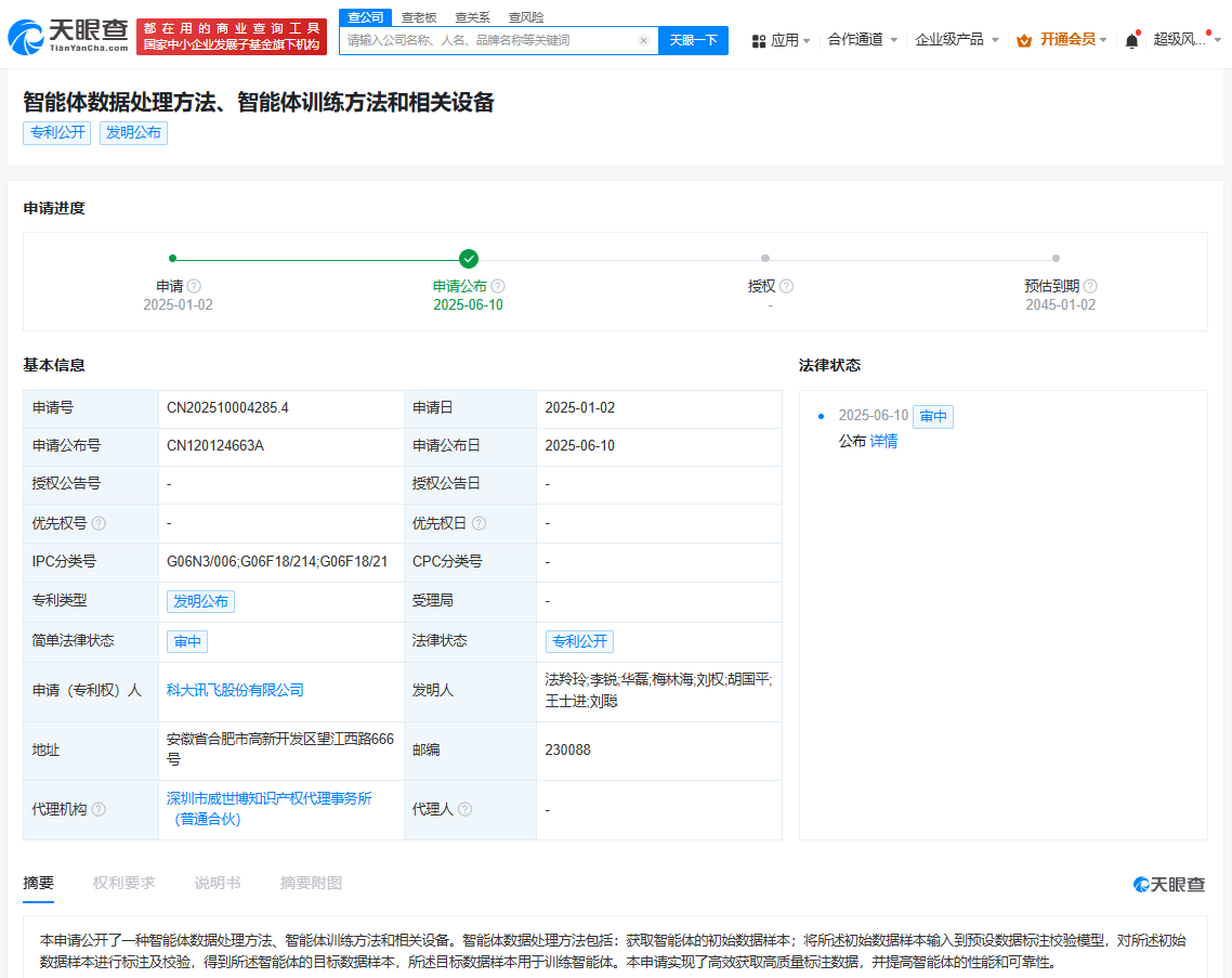天眼查财产线索信息显示,6月10日,科大讯飞股份有限公司申请的“智能体数据处理方法、智能体训练方法和相关设备”专利公布。