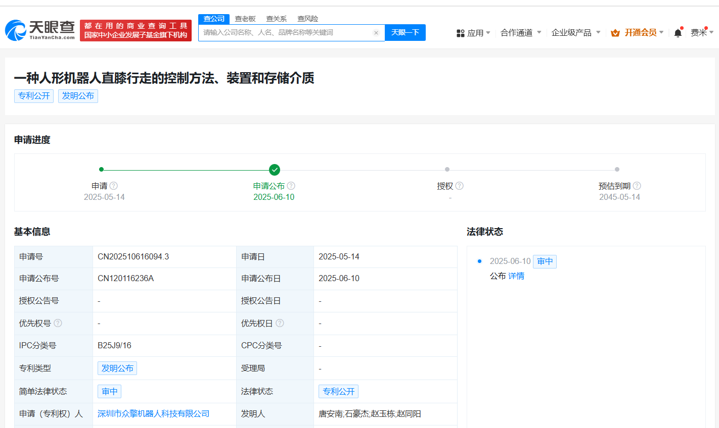 天眼查财产线索信息显示,近日,深圳市众擎机器人科技有限公司申请的“一种人形机器人直膝行走的控制方法、装置和存储介质”专利公布。