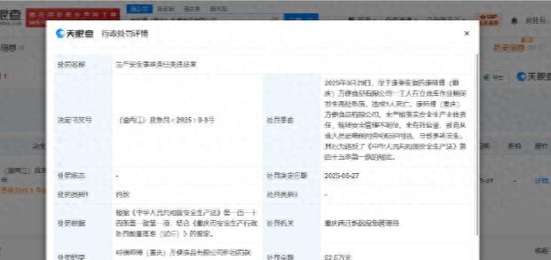 处罚事由显示,2025年3月29日,位于康美街道的康师傅(重庆)方便食品有限公司一工人在立体库作业期间发生高处坠落,造成1人死亡。康师傅(重庆)方便食品有限公司,未严格落实安全生产主体责任,现场安全管理不到位,未有效监督、教育从业人员正确使用劳动防护用品,导致事故发生。其行为违反了《中华人民共和国安全生产法》第四十五条第一款的规定。