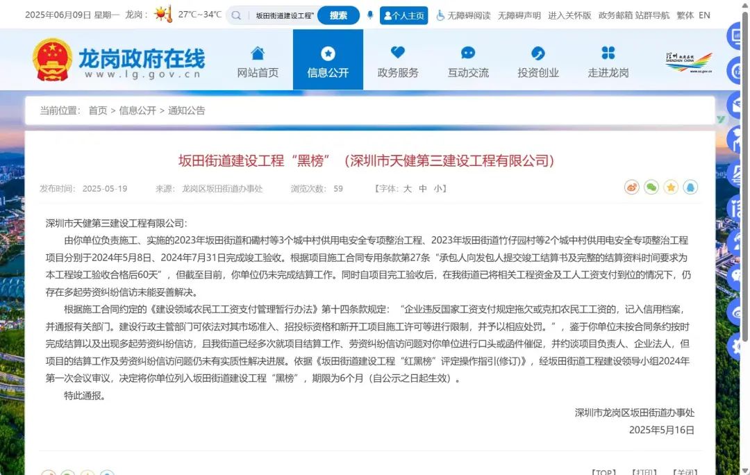 鉴于该单位未按合同条约按时完成结算以及出现多起劳资纠纷信访,且龙岗区坂田街道已经多次就项目结算工作、劳资纠纷信访问题对上述单位进行口头或函件催促,并约谈项目负责人、企业法人,但项目的结算工作及劳资纠纷信访问题仍未有实质性解决进展。依据《坂田街道建设工程“红黑榜”评定操作指引(修订)》,经坂田街道工程建设领导小组2024年第一次会议审议,决定将深圳市天健第三建设工程有限公司列入坂田街道建设工程“黑榜”,期限为6个月(自公示之日起生效)。