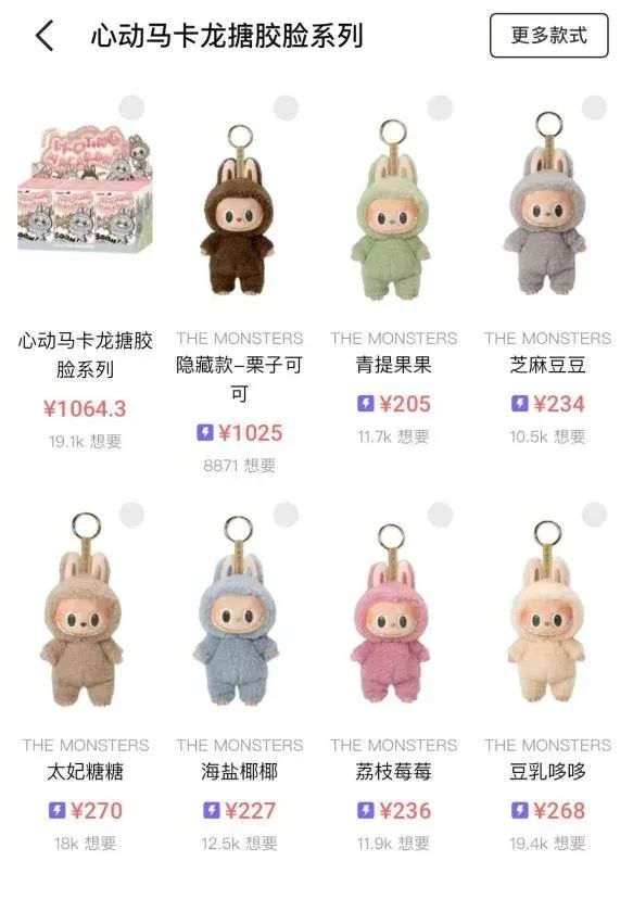 在某潮玩平台,可以买到溢价版的盲盒,普通款售价约200-300元,隐藏款超1000元。