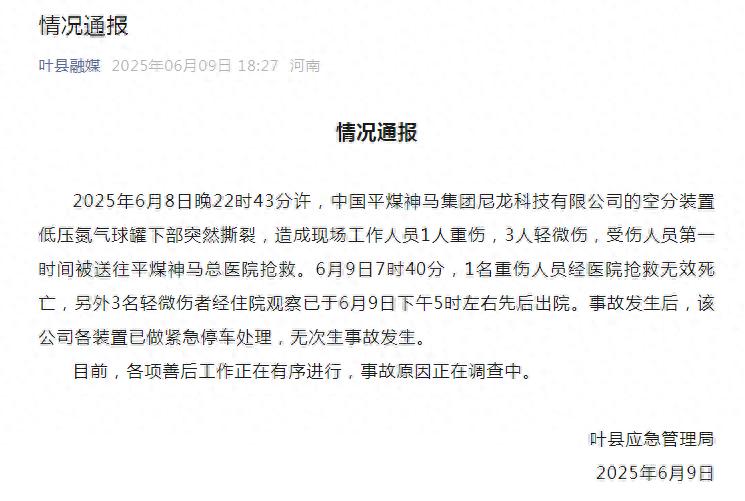 2025年6月8日晚22时43分许,中国平煤神马集团尼龙科技有限公司的空分装置低压氮气球罐下部突然撕裂,造成现场工作人员1人重伤,3人轻微伤,受伤人员第一时间被送往平煤神马总医院抢救。6月9日7时40分,1名重伤人员经医院抢救无效死亡,另外3名轻微伤者经住院观察已于6月9日下午5时左右先后出院。事故发生后,该公司各装置已做紧急停车处理,无次生事故发生。