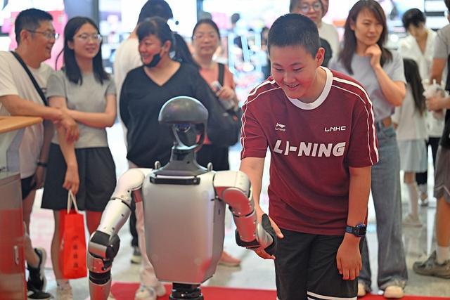 2025年5月2日,湖北宜昌的消费者与人形机器人进行互动。
