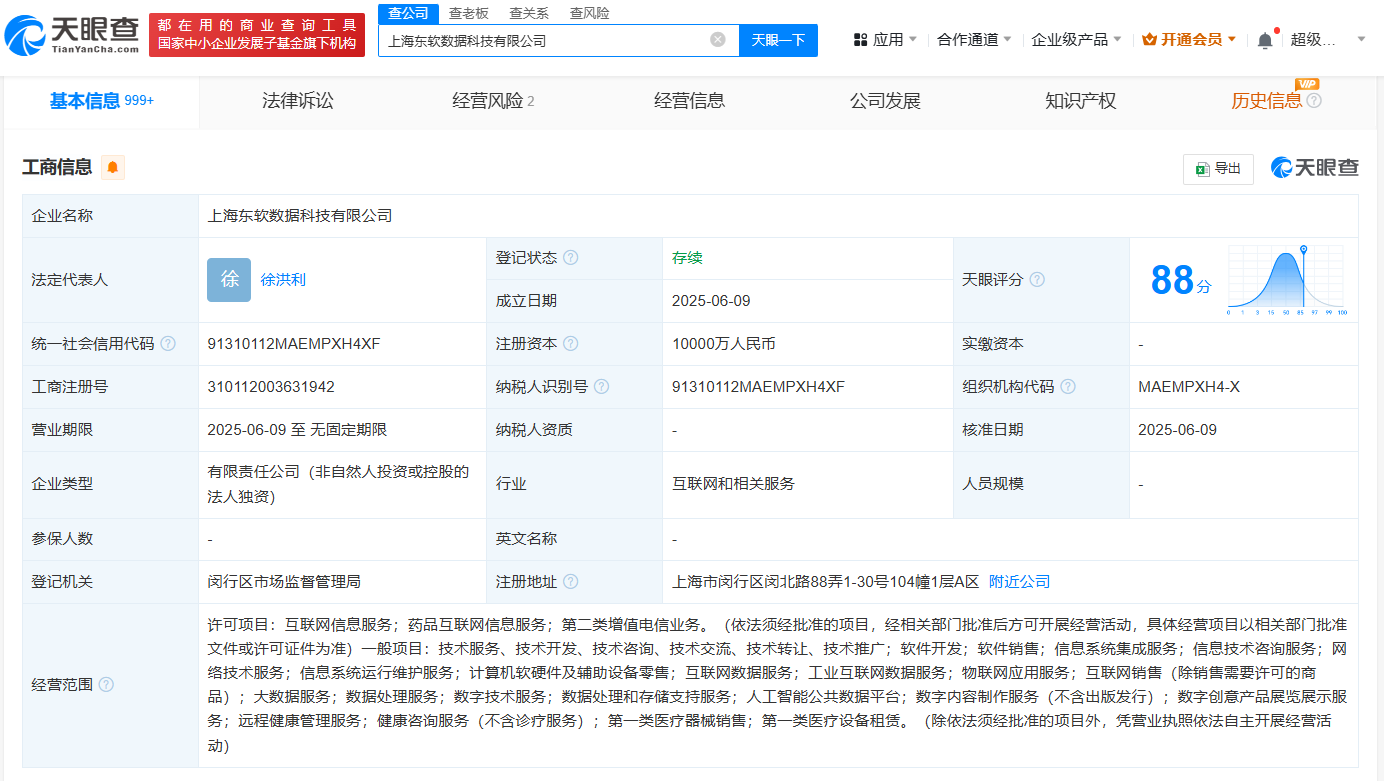 天眼查App显示,6月9日,上海东软数据科技有限公司成立,法定代表人为徐洪利,注册资本1亿人民币,经营范围包括软件开发、软件销售、信息系统集成服务、数据处理和存储支持服务、人工智能公共数据平台等。股东信息显示,该公司由东软集团(600718)全资持股。