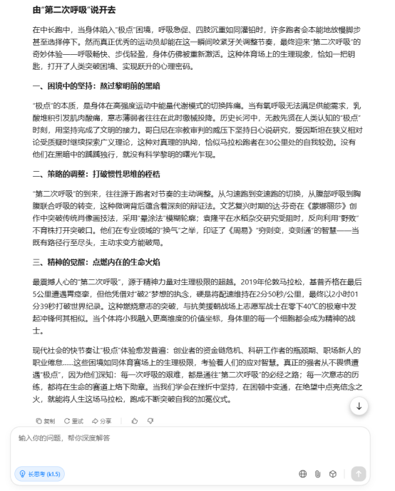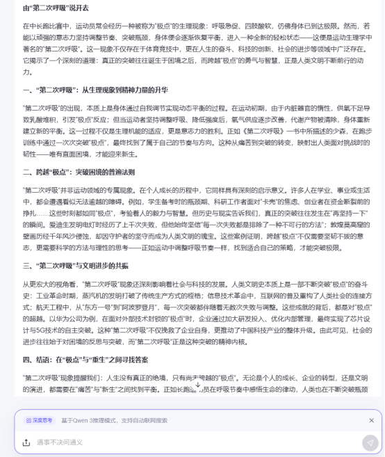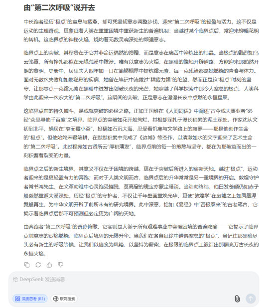 运动员在中长跑时会出现“极点”反应:呼吸艰难,四肢乏力。但通过调整节奏、激发斗志,越过极点后,身体会重获活力,奔跑会进入新阶段。这样的现象被称为“第二次呼吸”。其实,很多领域都存在类似现象。请以“由‘第二次呼吸’说开去”为题,写一篇议论文。要求:论点明确,论据充实,论证合理;语言流畅,书写清晰。(满分50分)