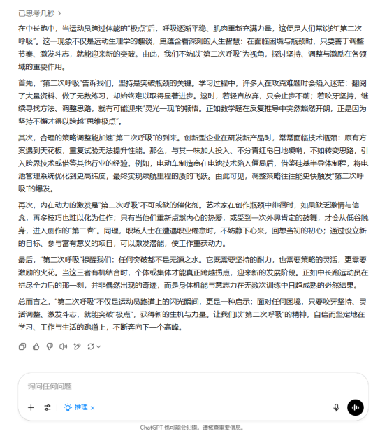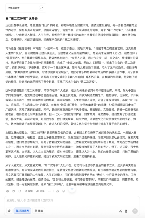 以下是将作文题目要求作为提示词输入大模型后,上述五款大模型产品在打开深度思考模式后生成的结果,以及何杰老师的评分和评语: