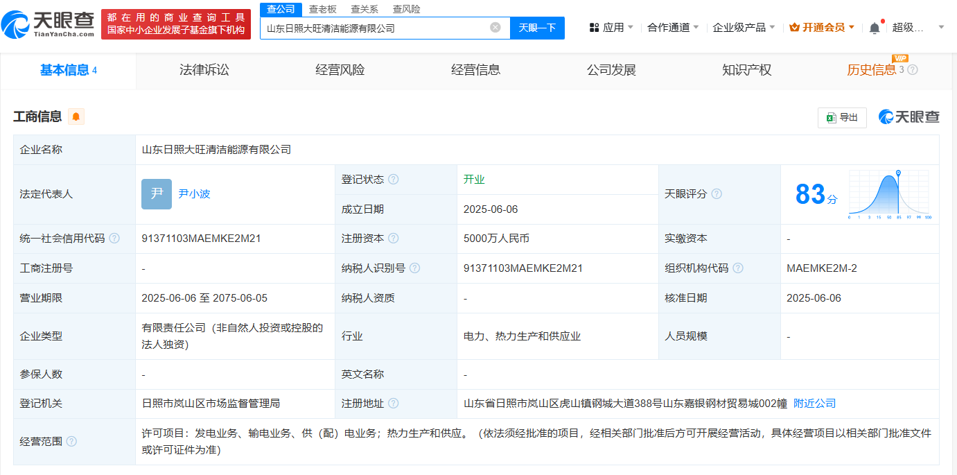 天眼查App显示,近日,山东日照大旺清洁能源有限公司成立,法定代表人为尹小波,注册资本5000万人民币,经营范围包括发电业务、输电业务、供(配)电业务,热力生产和供应。股东信息显示,该公司由中国广核(003816)全资持股。