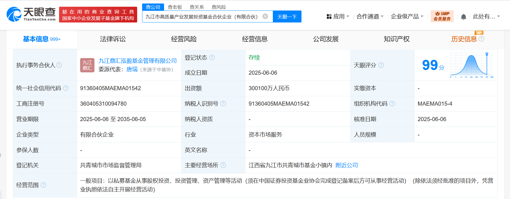 天眼查App显示,近日,九江市高质量产业发展投资基金合伙企业(有限合伙)成立,执行事务合伙人为九江鼎汇泓盈基金管理有限公司,出资额30.01亿人民币,经营范围为以私募基金从事股权投资、投资管理、资产管理等活动。合伙人信息显示,该基金由九江鼎汇泓盈基金管理有限公司、九江市发展产业投资合伙企业(有限合伙)、九江市工业产业投资引导基金合伙企业(有限合伙)共同出资。