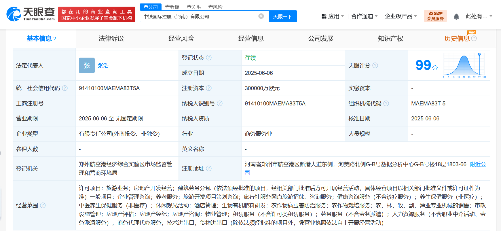 天眼查App显示,近日,中铁国际控股(河南)有限公司成立,法定代表人为张浩,注册资本30亿欧元,经营范围含旅游业务、房地产开发经营、建筑劳务分包、企业管理咨询、养老服务、旅游开发项目策划咨询、市政设施管理、房地产评估、房地产经纪等。股东信息显示,该公司由中铁国际投资集团有限公司全资持股。