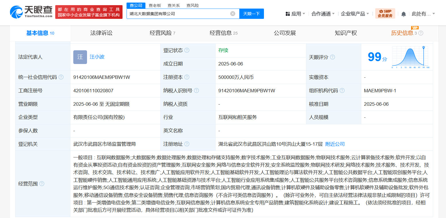 天眼查App显示,近日,湖北大数据集团有限公司成立,法定代表人为汪小波,注册资本50亿人民币,经营范围含互联网数据服务、大数据服务、数据处理服务、数据处理和存储支持服务、工业互联网数据服务、人工智能应用软件开发、人工智能基础软件开发、人工智能理论与算法软件开发、5G通信技术服务等。股东信息显示,该公司由长江产业投资集团有限公司、湖北交通投资集团有限公司、湖北省人民政府国有资产监督管理委员会、湖北港口集团有限公司等共同持股。