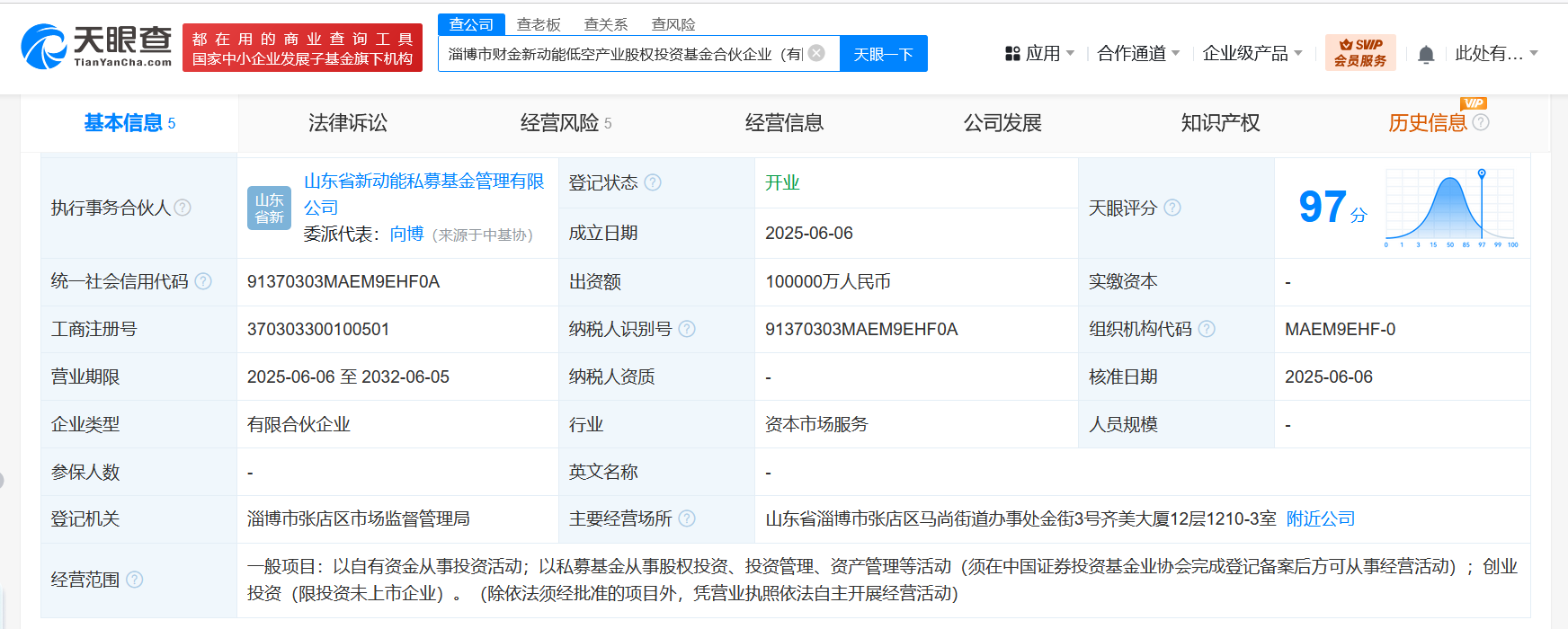 天眼查App显示,近日,淄博市财金新动能低空产业股权投资基金合伙企业(有限合伙)成立,执行事务合伙人为山东省新动能私募基金管理有限公司,出资额10亿人民币,经营范围为以自有资金从事投资活动,以私募基金从事股权投资、投资管理、资产管理等活动,创业投资。合伙人信息显示,该基金由淄博市财金控股集团有限公司、山东省新动能基金管理有限公司、山东财金科技创新股权投资基金合伙企业(有限合伙)、山东省新动能私募基金管理有限公司、齐信私募基金管理(淄博)有限公司共同出资。
