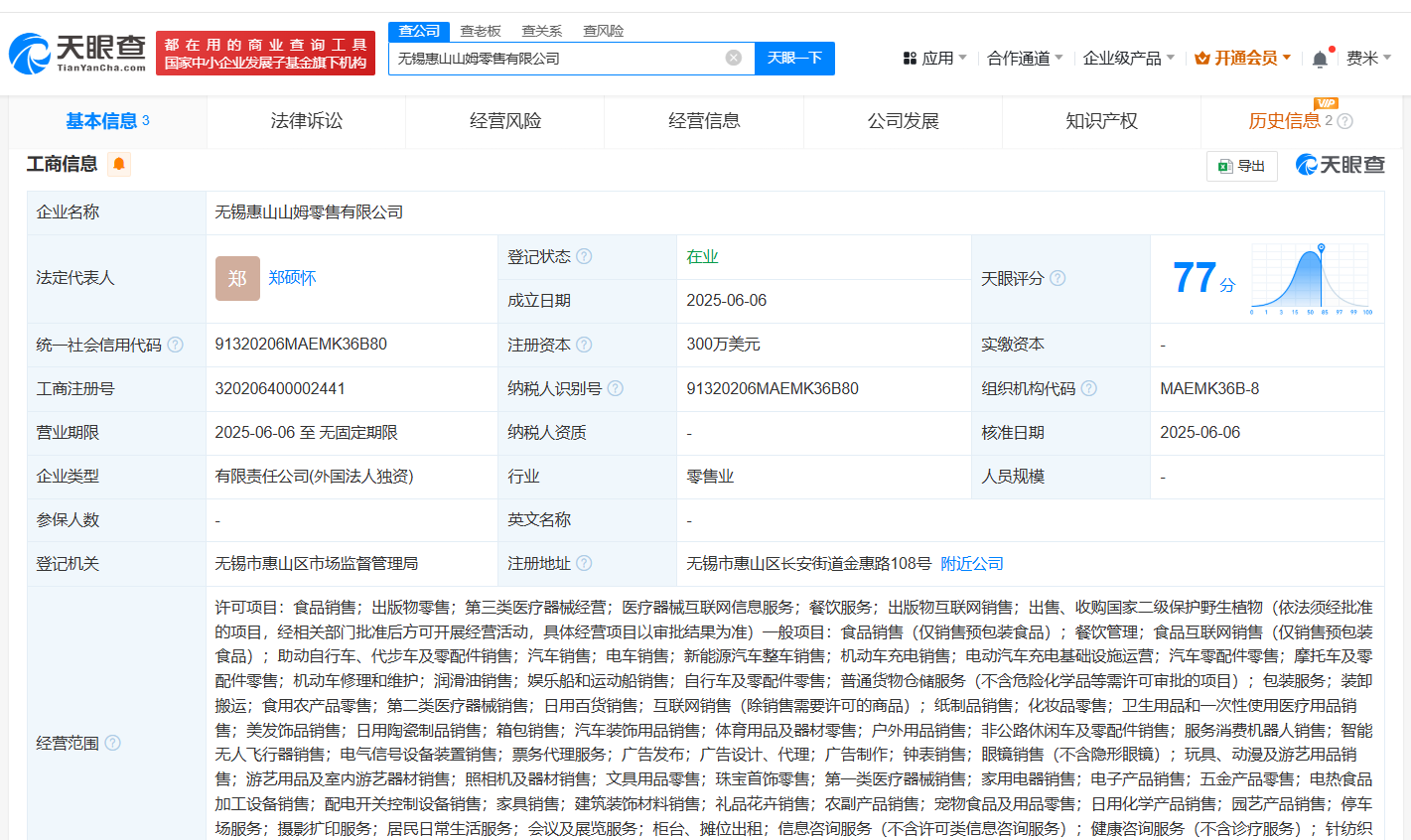 天眼查App显示,近日,无锡惠山山姆零售有限公司成立,法定代表人为郑硕怀,注册资本300万美元,经营范围包括食品销售、出版物零售、第三类医疗器械经营、医疗器械互联网信息服务、餐饮服务、出版物互联网销售等,由山姆(上海)投资有限公司全资持股。
