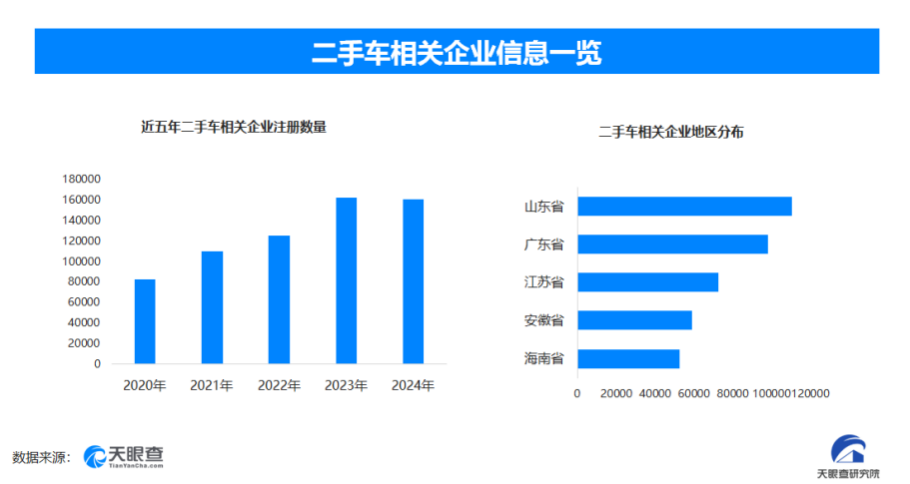 从区域分布来看,山东省、广东省、江苏省二手车相关企业数量位居前列,分别为超11万余家、9.8万余家和7.2万余家。