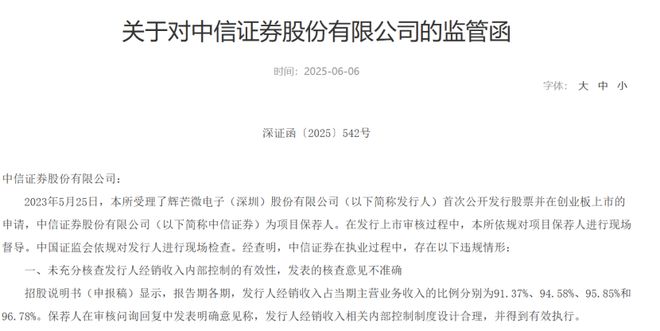 6月6日,深交所对中信证券下发警示函,并对两位保荐代表人予以通报批评,原因是其在保荐某首发项目过程中,督导工作存在三大违规情形。而在不久前的5月14日,中信证券及4位保荐代表人也曾遭到上交所监管警示。