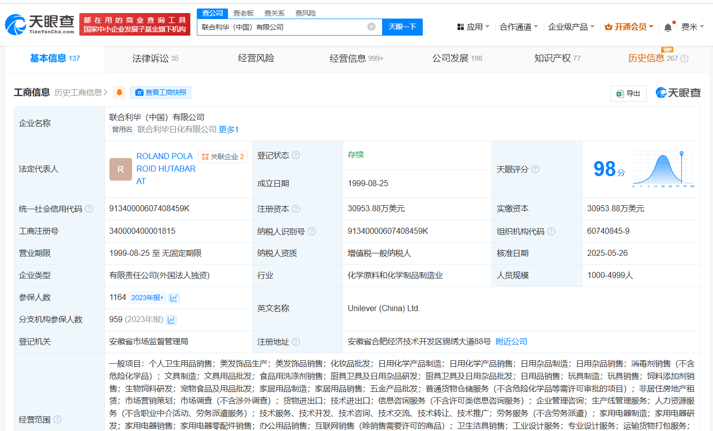 天眼查App显示,近日,联合利华(中国)有限公司发生工商变更,钟兆民卸任法定代表人、董事长,由ROLAND POLAROID HUTABARAT接任。