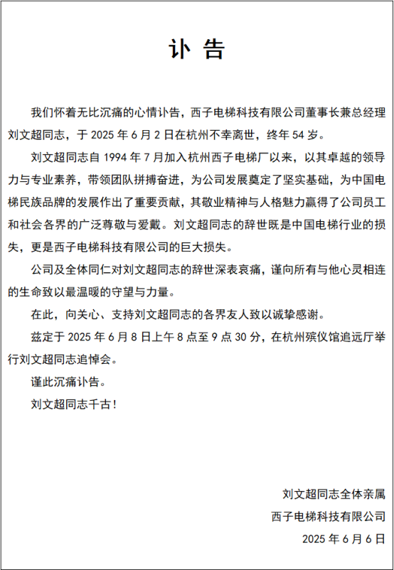 讣告称,刘文超同志自1994年7月加入杭州西子电梯厂以来,以其卓越的领导力与专业素养,带领团队拼搏奋进,为公司发展奠定了坚实基础,为中国电团梯民族品牌的发展作出了重要贡献,其敬业精神与人格魅力赢得了公司员工和社会各界的广泛尊敬与爱戴。刘文超同志的辞世既是中国电梯行业的损失,更是西子电梯科技有限公司的巨大损失。