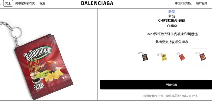 界面新闻在巴黎世家官网搜索发现,该网站并未有该款包饰出售,仅有一款“北京烤鸭”系列Chips挂饰/钥匙链在售,四种颜色,售价6500元,但目前处于缺货状态。