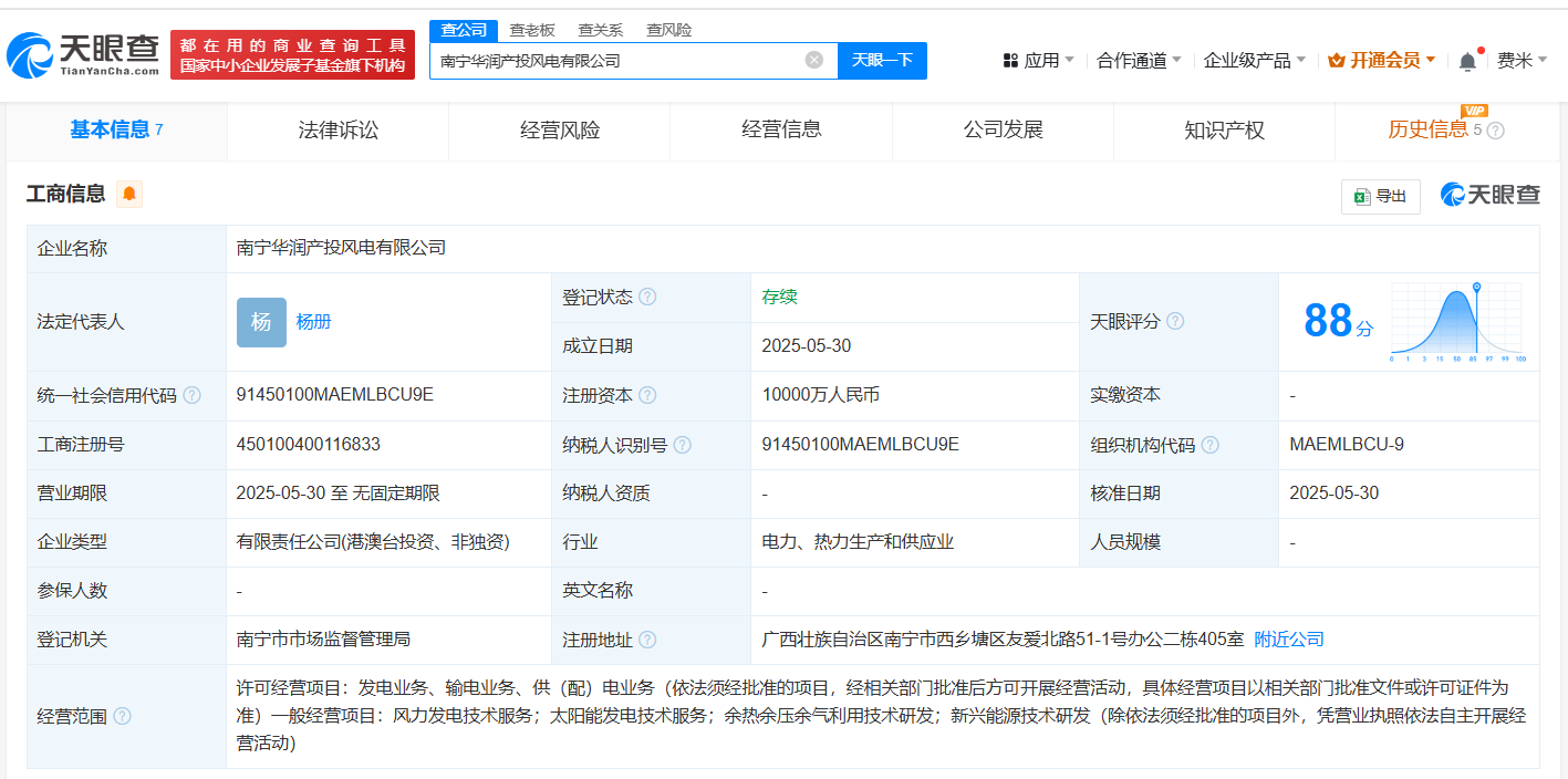 天眼查App显示,近日,南宁华润产投风电有限公司成立,法定代表人为杨册,注册资本1亿人民币,经营范围包括风力发电技术服务、太阳能发电技术服务、余热余压余气利用技术研发、新兴能源技术研发等,由华润电力新能源投资有限公司、南宁产投产业园区投资发展集团有限责任公司共同持股。