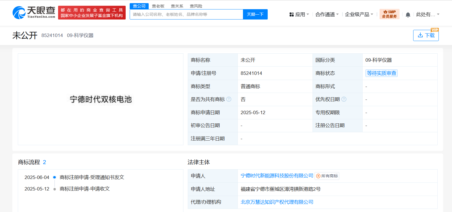 天眼查财产线索信息显示,近日,宁德时代(300750)申请注册“双核电池”“宁德时代双核电池”商标,国际分类均为科学仪器,当前商标状态均为等待实质审查。