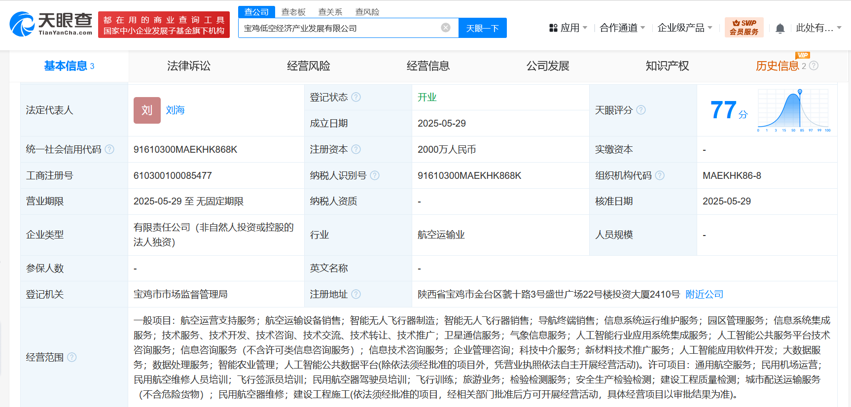 天眼查App显示,近日,宝鸡低空经济产业发展有限公司成立,法定代表人为刘海,注册资本2000万人民币,经营范围含航空运营支持服务、航空运输设备销售、智能无人飞行器制造、智能无人飞行器销售、导航终端销售、信息系统运行维护服务、信息系统集成服务、人工智能行业应用系统集成服务等,由宝鸡城市产业发展有限公司全资持股。