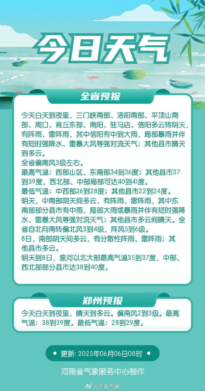 另据河南气象消息,今天白天到夜里,我省西部、南部、东部部分县市有阵雨、雷阵雨,其中信阳有中到大雨,局部暴雨并伴有短时强降水、雷暴大风等强对流天气。