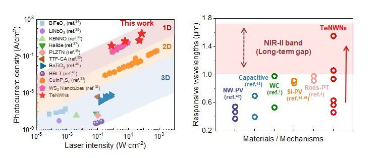 该科研团队在接受澎湃新闻记者采访时表示,通常而言的“可见光”,指人类视网膜可感知的光谱范围(380-780nm)。在全球,有超2亿的视网膜变性(感光细胞死亡)患者无法感受这样的“光明”。此次,复旦联合上海技物所科研团队研制出碲纳米线网络(TeNWNs)视网膜假体,该器件的光电流密度达到了当前已知体系的最高水平,并首次实现了国际上光谱覆盖最宽的视觉重建与拓展,范围横跨可见光至近红外二区。