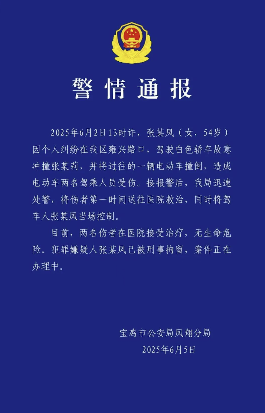 经公安机关调查,张某凤现年54岁,系凤翔区城关镇东关社区党总支书记、居委会主任,为市、区两级人大代表,因个人纠纷驾驶私家车故意冲撞张某某(女,50岁),期间将一辆过往电动车撞倒,造成驾乘人员乔某某(男,61岁)、刘某某(女,60岁)受伤。目前,两人伤情平稳。