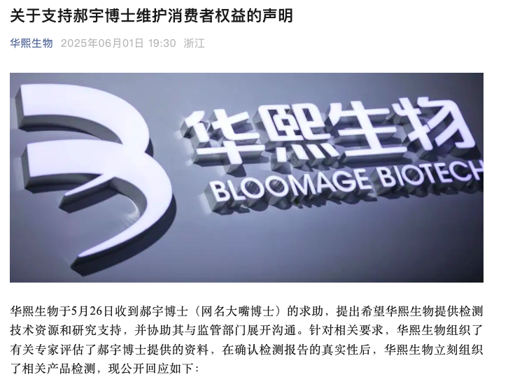 同时,华熙生物在《声明》中称:公司已组织专家对郝宇提供的资料进行审慎评估和多方法的反复测试,华熙生物也已经得到了第三方机构的检测结果。