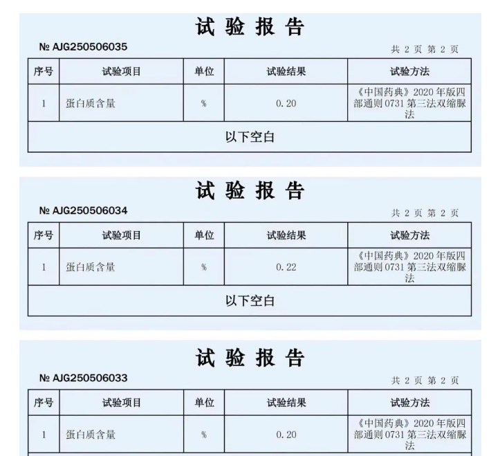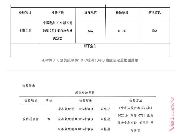 此后,公司又将上述送检的三个批次中的其中一个批次产品送至C检测机构用双缩脲法进行交叉检验,结果显示,本批次产品的重组胶原蛋白含量同样大于0.1%,为0.17%。