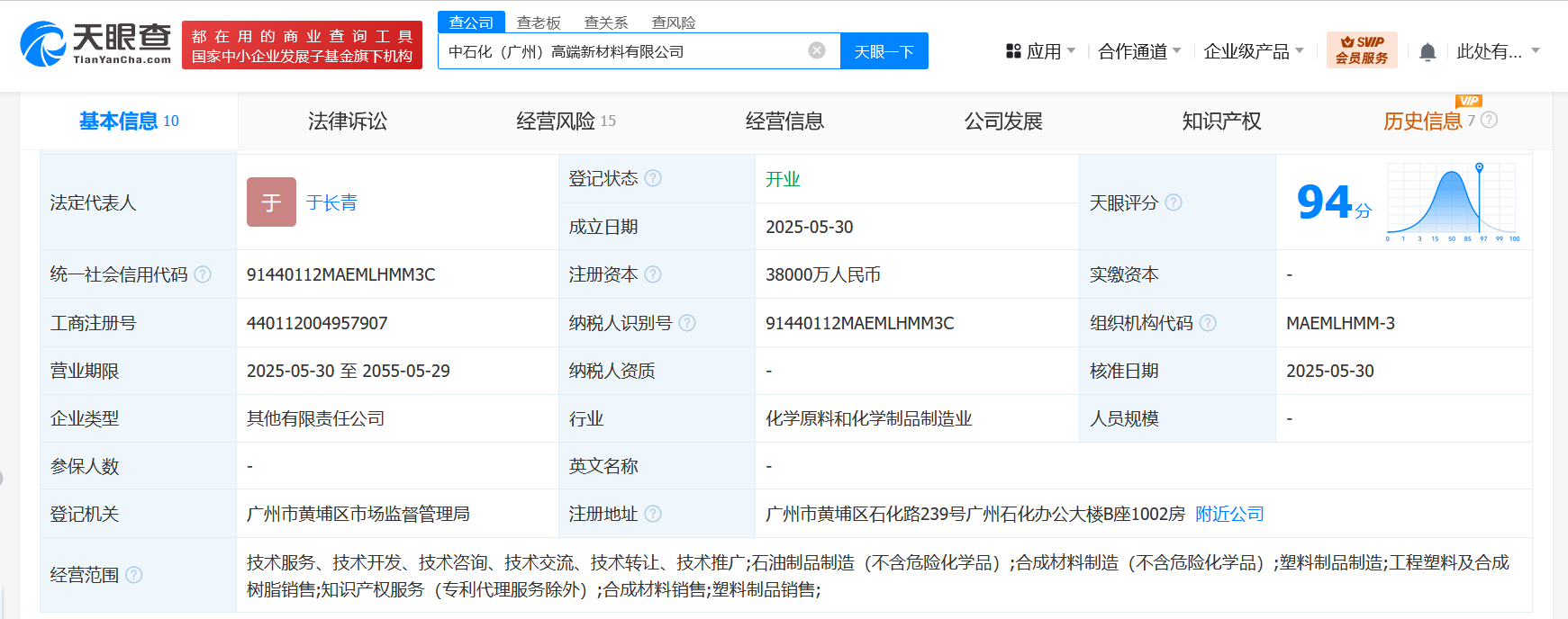 天眼查App显示,近日,中石化(广州)高端新材料有限公司成立,法定代表人为于长青,注册资本3.8亿人民币,经营范围含石油制品制造、合成材料制造、塑料制品制造、工程塑料及合成树脂销售、知识产权服务等。股东信息显示,该公司由中国石化(600028)、广州工业投资控股集团有限公司、穗恒运A(000531)分别持股80%、10%、10%。