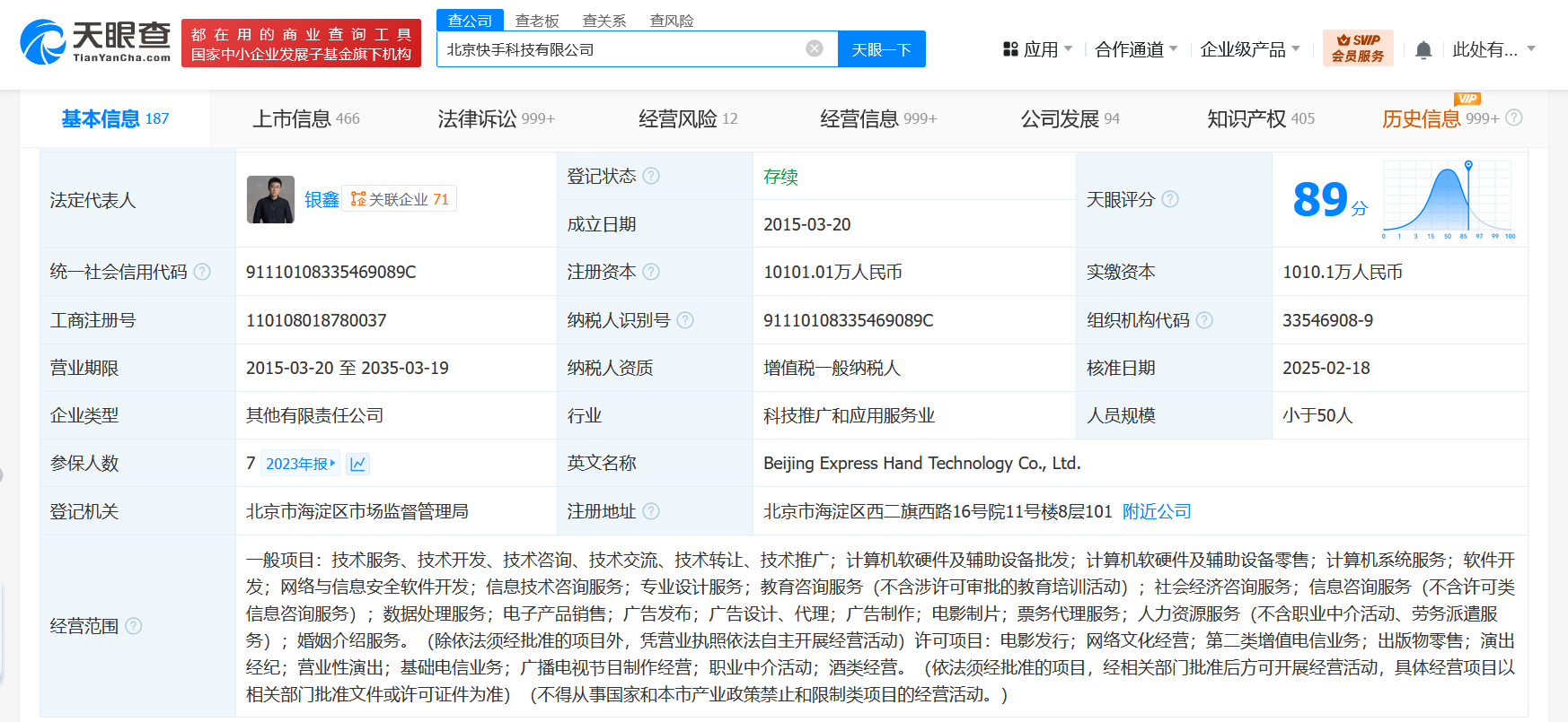 北京快手科技有限公司成立于2015年3月,法定代表人为银鑫,注册资本约1.01亿人民币,由北京华艺汇龙网络科技有限公司、北京广播电视台分别持股99%、1%。