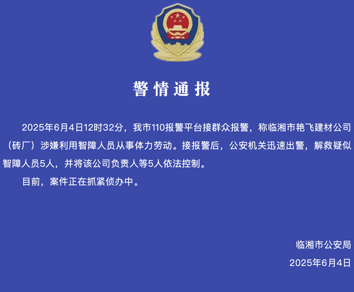 湖南临湘市公安局发布警情通报:2025年6月4日12时32分,我市110报警平台接群众报警,称临湘市艳飞建材公司(砖厂)涉嫌利用智障人员从事体力劳动。接报警后,公安机关迅速出警,解救疑似智障人员5人,并将该公司负责人等5人依法控制。目前,案件正在抓紧侦办中。