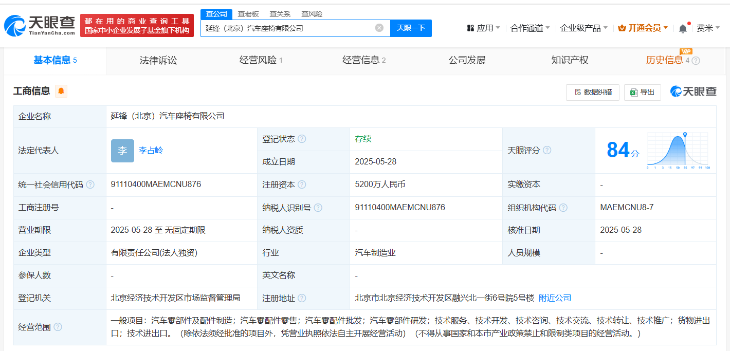 天眼查App显示,近日,延锋(北京)汽车座椅有限公司成立,法定代表人为李占岭,注册资本5200万人民币,经营范围包括汽车零部件及配件制造、汽车零配件零售、汽车零配件批发、汽车零部件研发、货物进出口、技术进出口等,由华域汽车(600741)旗下延锋国际座椅系统有限公司全资持股。