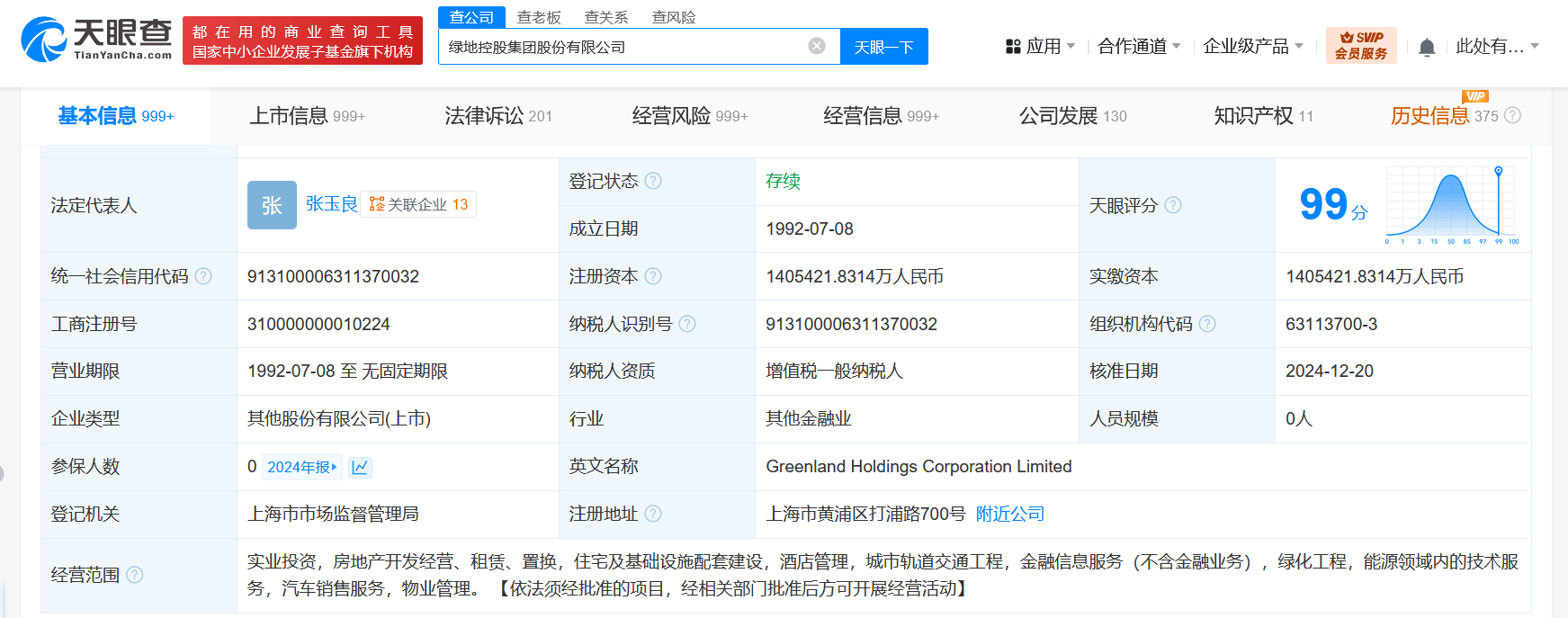 绿地控股集团股份有限公司成立于1992年7月,法定代表人为张玉良,注册资本约140.54亿人民币,由上海格林兰投资企业(有限合伙)、上海地产(集团)有限公司、上海城投(集团)有限公司、中国证券金融股份有限公司等共同持股。