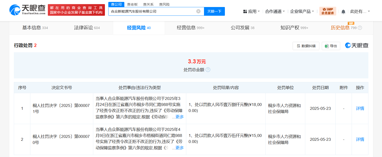 天眼查深度风险信息显示,近日,哪吒汽车关联公司合众新能源汽车股份有限公司新增2条行政处罚信息,处罚总金额3.3万元,处罚单位均为桐乡市人力资源和社会保障局。