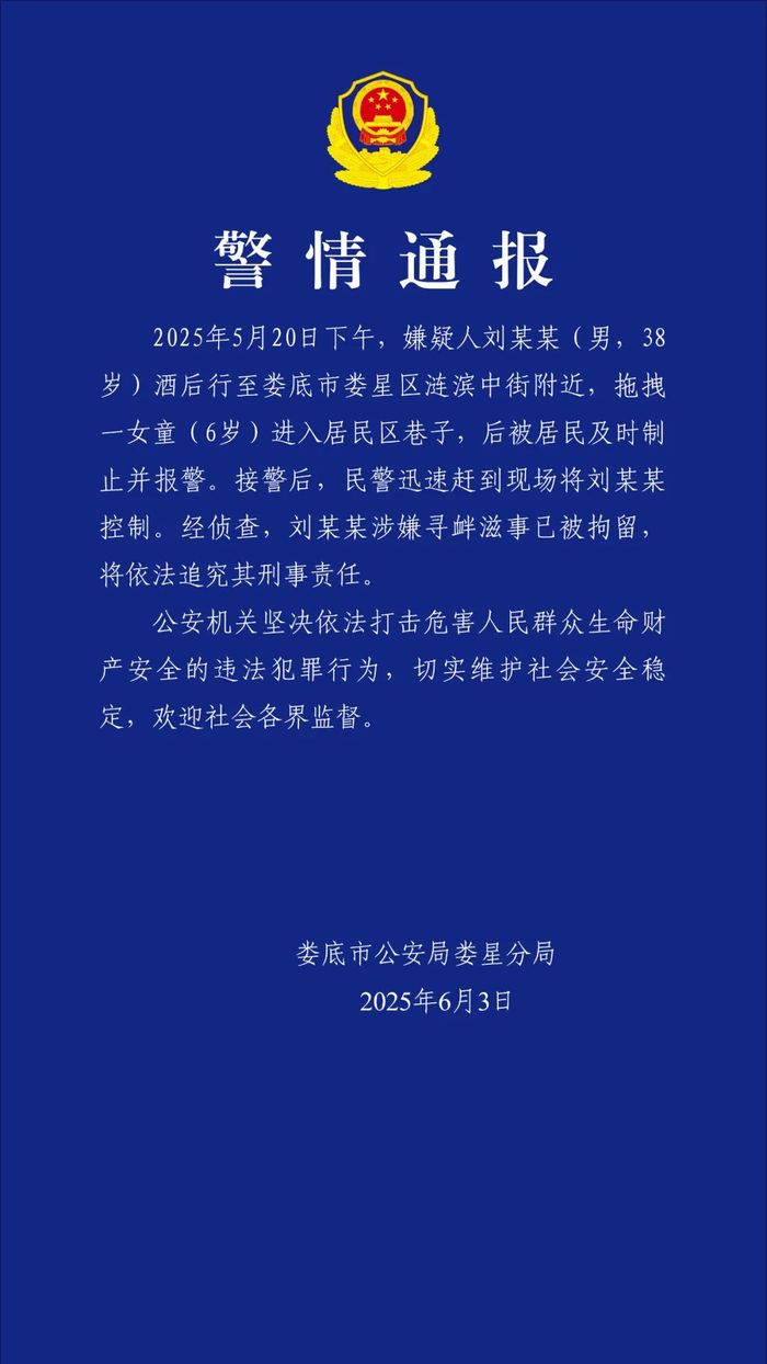 6月3日,湖南娄底市公安局娄星分局通报,5月20日下午,嫌疑人刘某某(男,38岁)酒后行至娄底市娄星区涟滨中街附近,拖拽一女童(6岁)进入居民区巷子,后被居民及时制止并报警。接警后,民警迅速赶到现场将刘某某控制。经侦查,刘某某涉嫌寻衅滋事已被拘留,将依法追究其刑事责任。