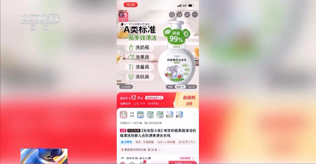记者注意到,这款样品的网页上显示“洁净去污”“抑菌99%”“一瓶多效清洁”“宝宝入口更安心”。