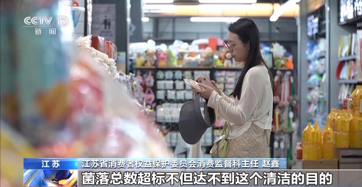 江苏省消费者权益保护委员会消费监督科主任 赵鑫:菌落总数超标,表明产品在生产或储运过程中可能存在着污染的问题,也反映了企业在产品出厂质检方面存在着漏洞。因为菌落总数这种指标,消费者是没有办法在使用过程中发现和感知到的,菌落总数超标不但达不到清洁的目的,反而可能适得其反,甚至危害孩子的健康。