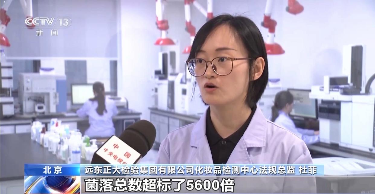 远东正大检验集团有限公司化妆品检测中心法规总监杜菲:它的菌落总数和大肠菌群都属于严重超标。其中菌落总数超标了5600倍,大肠菌群超标了116000多倍。