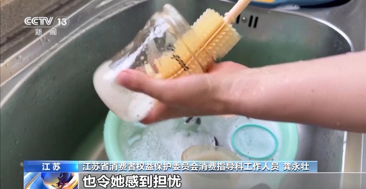 江苏省消费者权益保护委员会消费指导科工作人员 龚永壮:有消费者反映,在网上购买的奶瓶清洗剂瓶子内部有小黑点,这样的奶瓶清洗剂的生产环境、安全卫生状况如何,令人感到担忧;还有消费者反映,所购买的奶瓶清洗剂清洗奶瓶还是油油腻腻,用得比较糟心,怀疑奶瓶清洗剂的清洗效力到底如何。
