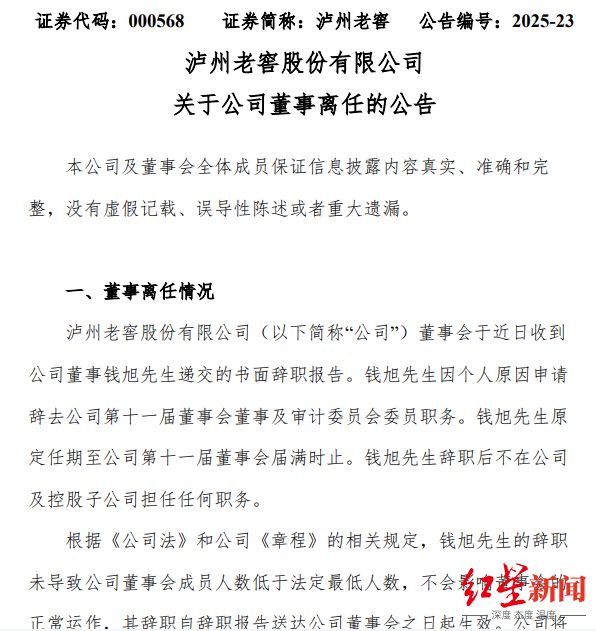 日前,泸州老窖(000568.SZ)发布公告称,公司董事会近日收到董事钱旭递交的书面辞职报告,钱旭申请辞去公司第十一届董事会董事及审计委员会委员职务,辞职后不在公司及控股子公司担任任何职务。