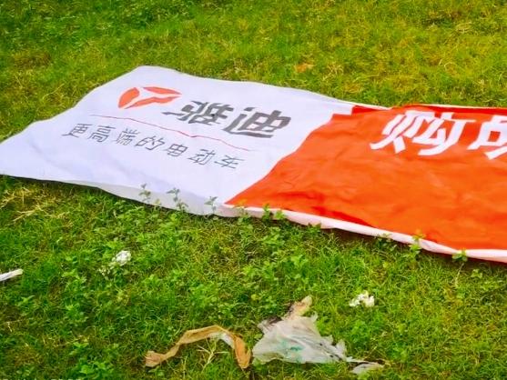 现场遗留的雅迪宣传横幅。